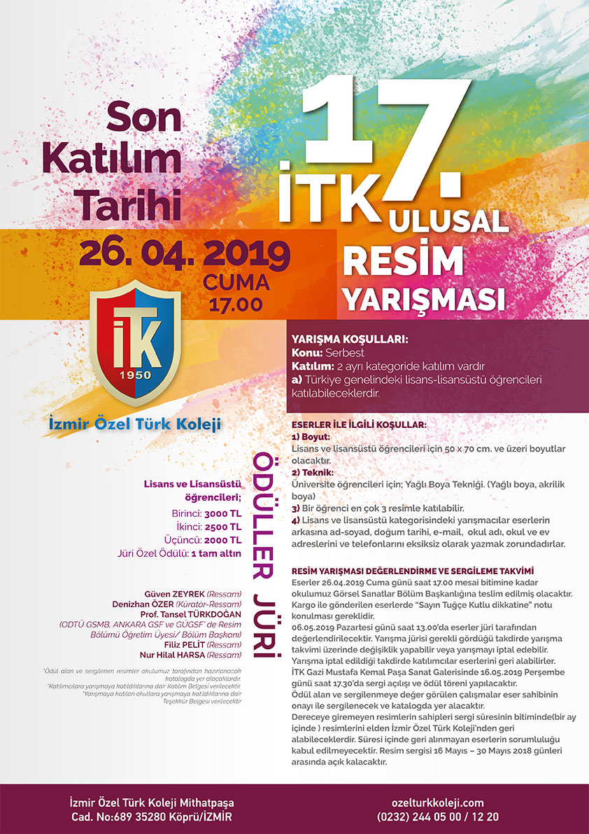 İzmir Özel Türk Koleji, 2018-2019 Eğitim ve Öğretim yılında Türkiye genelindeki Ortaokul, Lise ve dengi okullar ile Lisans-Lisansüstü öğrencilerini kapsayan “Geleneksel İTK Ulusal Resim Yarışması” nın 17.’si düzenlenmektedir.